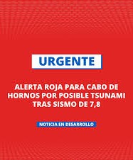 El Servicio Nacional de Prevención y Respuestas ante Desastres declaró Alerta Roja para la comuna de Cabo de Hornos, en la región de Magallanes y de la Antártica Chilena, tras el sismo de 7,8.